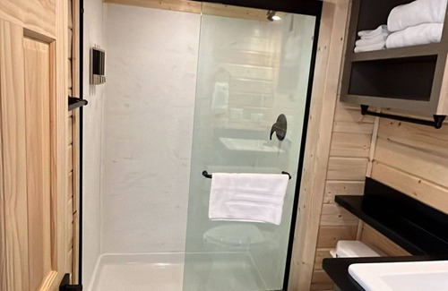Escape to our newly built chalet, a cozy retreat nestled amidst breathtaking nature. Unwind in the king-sized bed, perfect for a restful night’s sleep after a day at Grand Canyon National Park. Perfect for viewing sunsets, sunrises, and night stargazing. A modern full bathroom ensures comfort and convenience during your stay, with shower gel, shampoo, and conditioner provided.
