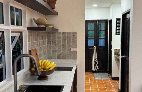 The house is surrounded by tropical greenery and an edible garden with lime, chili, and holy basil plants. At the front, there’s a large mango tree that has stood since the house was built, alongside a grassy lawn perfect for yoga or relaxing.