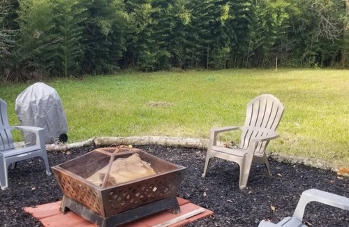 The huge yard features a fire pit with wood included, seating and a barbecue pit.