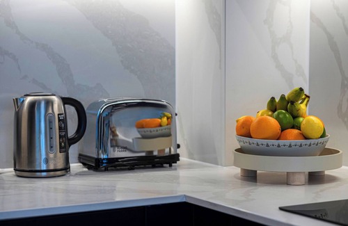 The modern marble effect suite with chrome fittings gives you an attractive space in which to freshen up and get ready for days and nights out in London. Towels are provided by your hosts (they’ll be waiting for you on the bed), and you have plenty of room to store your soaps, gels, lotions and other toiletries.