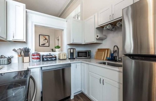 Welcome to your chic urban sanctuary! Recently renovated, this space radiates modern charm and functionality. The open-concept layout leads to a bright living area with a large flat-screen TV, ideal for unwinding after exploring the city. Discover a kitchen adorned with quartz countertops, sleek white cabinets, and stainless steel appliances, including a Keurig coffee maker for your daily brew.