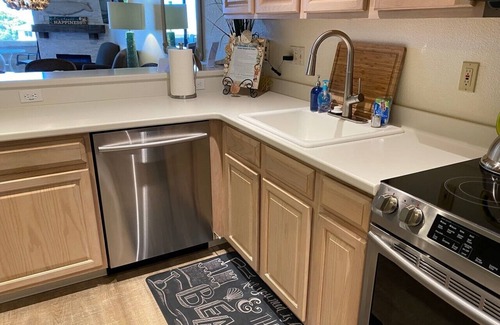 On the first floor: Fully stocked kitchen with full size appliances (in case you feel like cooking) the dining area is large enough to comfortably seat 6, plus a breakfast bar with 2 bar stools, a corner gas burning fireplace to cozy up to, a comfortable queen size sofa sleeper, new laminate flooring on the first floor, flat screen TV, DVD player and free Wi-Fi access, a Blue-tooth stereo player so you can connect to Pandora or your favorite music and listen thru built in ceiling speakers. plus a new Weber BBQ. and 1/2 bath.