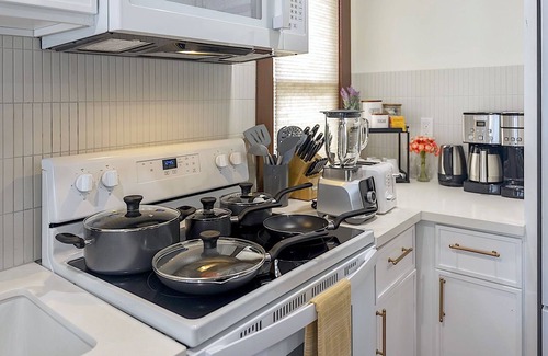 Kitchen: Well-equipped kitchen with refrigerator, electric stove, microwave, dishwasher, toaster, blender, coffee station, hot water kettle, pots/pans. 4 counter stools for dining.