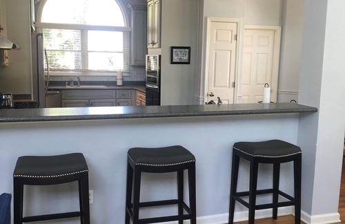 This home is ideal for large group gatherings, with inside dining seating for 15 including bar stools/kitchen table for 4 and dining table that seats 8. Additional dining seating for 12 on the hot tub deck and lower screen porch. A brand-new (2020) gas connected grill is provided for easy cooking. The large deck area around the salt water pool provides sunny seating with 8 new luxurious loungers(2021)
