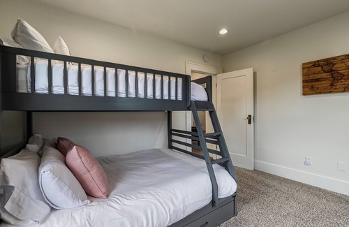 The second bedroom has a bunk bed with a twin on top and full on the bottom. There is a dresser for your clothing. The windows have blinds and blackout curtains. A small bean bag chair, reading pillow, and kids books and toys give kids are also in the room.