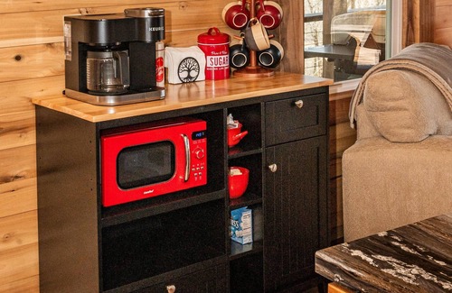 Upon arrival, you will notice a restful feeling as you drink in nature’s bounty, nestled amongst the tree tops as you climbs the stairs to enter the front door. Entering the first floor, you will find a cozy living room with an electric fireplace. Snuggle up by the fire and watch a DVD movie on the 55" smart TV or just admire the wood interior around you.