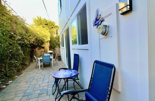 The house architecture provides total privacy; with guest having an exclusive use of the downstairs, fenced in back/side yards, outdoor shower, Weber BBQ, and 2 car driveway. Only the front yard is shared with the owners. There is practically no street parking. The rental comes with a 2 parking spaces in the driveway.
