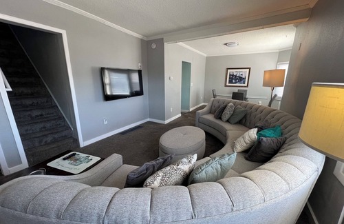 As a traveler, you'll appreciate the home's thoughtful amenities, including free WiFi, a washing machine and dryer, and a smart TV with YouTubeTV. The fully stocked kitchen, complete with a stove, oven, refrigerator, microwave, and dishwasher, allows you to easily prepare meals during your stay. Unwind in the cozy living room or enjoy a cup of coffee at the dining table.