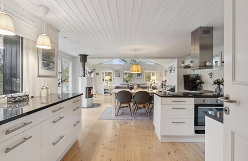 Escape city life and travel to the Danish Riviera, where this beautiful house awaits you. As soon as you enter, you will feel at home and can move into the bright and decorated rooms. The large living room, which connects the kitchen with the dining area and the living room, is spacious and very inviting. You can make yourself comfortable on the numerous sofas while a fire crackles in the wood-burning stove. From here you can also step out onto the large wooden terrace in several places, which is partially covered and invites you to barbecue together in the evening or sunbathe during the day.