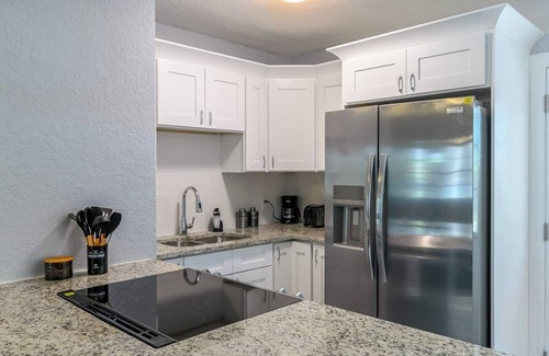 The heart of this Tampa retreat is the newly renovated kitchen. The granite countertops enhance the beauty of the space, creating a perfect backdrop for culinary endeavors and the open floor plan seamlessly connects the living room, kitchen, and a nicely sized dining table that can seat up to 4. The kitchen is equipped with three stools against the countertop, offering a cozy spot for casual dining.
