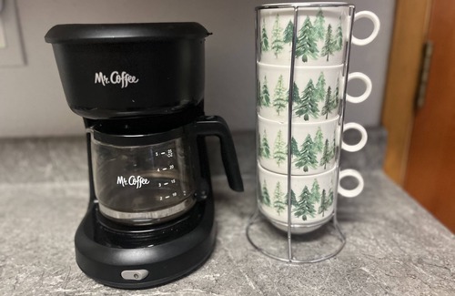 Fully Equipped Kitchen: Includes a coffee maker, slow cooker, air fryer, bottled water dispenser, and complimentary coffee, tea, hot cocoa and condiments.