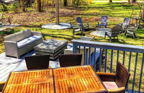 Backyard--Large Patio Table, Warmly Lit Area with Couches for Lounging, Adirondack Chairs and Fire Pit (bring your own firewood)