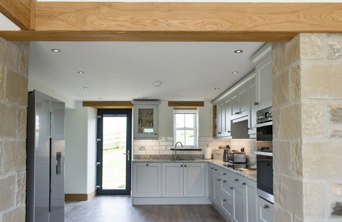 Shower Room: Cubicle Shower, Heated Towel Rail, Toilet. Underfloor ground source heating, electricity, bed linen, towels and Wi-Fi included. Initial logs for wood burner included. Welcome pack.. Garden with sitting-out area and garden furniture (shared with other porperties on-site). Electric car charging point, at cost. Private parking for 2 cars. No smoking. Please note: Sorry, no hen or stag parties. This property has a natural water supply from a spring.. With ground source underfloor heating, large picture windows bringing the outside in, and tasteful fixtures and fittings throughout this is a beautiful holiday home. Boasting oak beams and exposed stonework adding to the overall finish throughout, this property is full of character and charm. A beautiful dining room with bi-fold doors and overhead glass gallery looks out across the dales, while the comfortable living room has a wood burner, comfortable sofas and a Smart TV. The property has lots of space to accommodate a family with a variety of needs. A ground floor bedroom has a large en-suite bathroom and upstairs a combination of sleeping arrangements, the twin room with TV; ideal for the kids to escape and enjoy their own space.