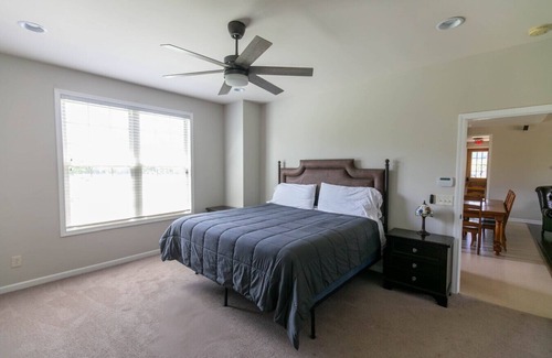 The house has 2 master bedrooms downstairs (one with a king bed, one with a queen bed) and 2 additional bedrooms upstairs (one with 2 twin beds, one with 3 twin beds) each with its own full bathroom as well. There is an additional half bath on the first floor. Each room also has a walk-in closet. The main living area is spacious and open with a living room, dining area, and full kitchen. There is also a substantial utility room with a washer and dryer.