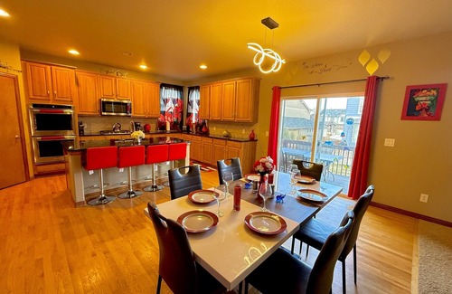The fully equipped kitchen is a chef’s dream, featuring expansive granite countertops and top-notch appliances, perfect for preparing everything from quick snacks to gourmet meals. The space flows seamlessly into the dining area, where three elegant dining tables provide ample seating for up to eight guests. Whether you’re hosting a formal dinner or enjoying a casual breakfast, the setup ensures comfort and style for every occasion. This inviting space is ideal for creating memorable meals and moments with family and friends.