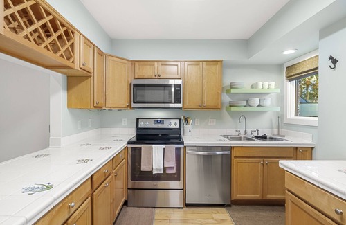 This villa offers a one-story layout with ample living space and an abundance of natural light. In the living area, you will find comfortable seating, a flat-screen TV, and glass sliding doors access to the deck and screened porch. The fully equipped kitchen opens to the dining area, offers stainless steel appliances, and provides enough counter space to prepare your vacation meals. The dining area offers ample seating for your whole party.
