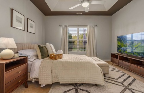 The living room boasts a generous seating area and a large smart TV with streaming services. It's a great place for movie nights and relaxation. Each of the four bedrooms is tastefully designed with comfort in mind.
