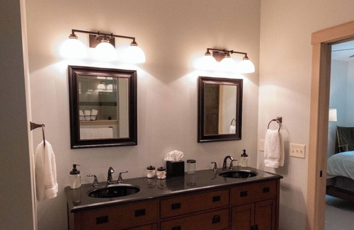 - Bedroom 3: King bed with memory foam mattress, desk, and full bathroom / shower en-suite. This very large bedroom will comfortably accommodate pack-n-plays provided, as well as toddler blow-up beds that families often bring for little ones.