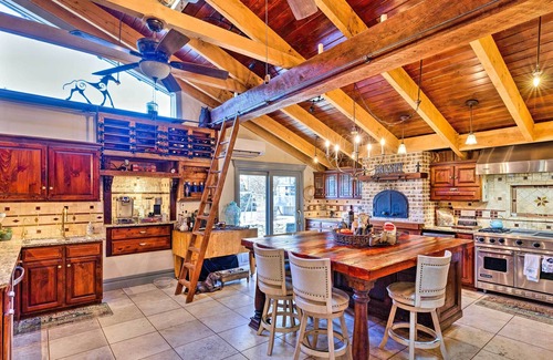 INDOOR LIVING: Smart TVs, wood-burning stove, books, board games, exposed beam ceilings, ceiling fans, 2 dining tables, desk workspace w/ monitor, electric fireplaces, game room w/ pool table, ping pong table, foosball table, video games, wet bar, 10-person movie theater room, movie snack bar, fitness room, pub area
