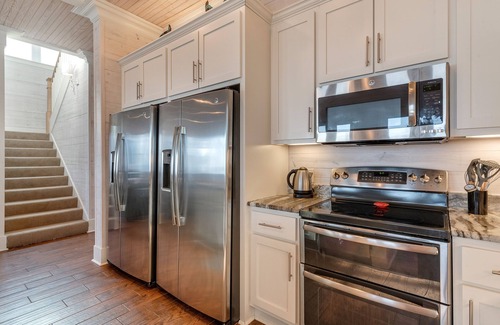 On the second floor (floor plan in photo section): an expansive great room with open plan features a full kitchen with granite counter tops, large enough for several cooks and with high end stainless steel appliances and bar seating (seats 6), a large dining table (seats 12 comfortably), and a beautifully furnished living room (all facing the Gulf) with a large screen smart/internet (fiber speed up to 1000 Mbps) ready 65 inch Samsung LED HDTV!! The large gourmet kitchen, overlooking the emerald waters of the Gulf, is fully equipped with 2 side-by-side refrigerators (great for minimizing shopping trips and for separating multifamily and special groceries), furnished with LeCreuset cookware, high end appliances (including 2 refrigerators), coffee machines (Mr Coffee, Keurig machine, French press, and Bialetti express espresso maker), all inviting to large gatherings around a central island capped with granite and an over-sized kitchen table perfect for sharing memorable multi-generational meals and enjoying each others' company...