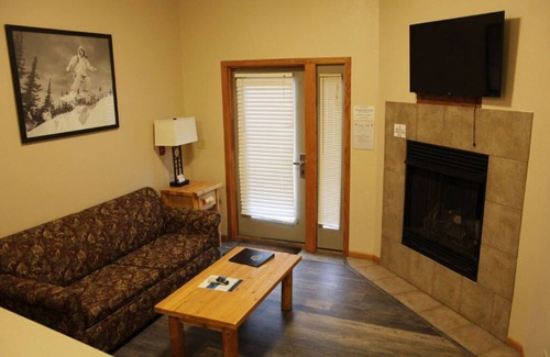 • Living Area: 1 pull-out sofa bed, flat-screen TV with cable channels, cosmetic fireplace (non-functional)