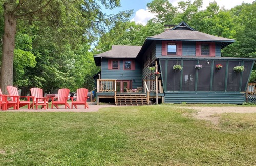 A recently renovated recreational paradise on the water in the Adirondacks with 6 bedrooms and 4 baths. The "Adirondack Stags Leap" vacation home was built as a large single-family summer home in the 1930's in the historic Adirondack "Camp" style, with major renovations in 2016-2019. It was designed by a well-known Adirondack architect on a double lot that includes a wooded area, private tennis court, volleyball courts (sand & grass), large yard, fire pit, boathouse with dock and wide waterfront. This camp offers incredible recreation and living space for multiple families, couples, friends, or extended families alike. It is ideal for a revitalizing spring, a fun-filled summer and an adventurous autumn and the famous Adirondack color-changing leaves. We have magnificent trees on sight and the fall view of the hillside across the Channel is a must-see.
