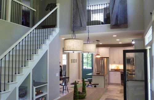 The Finch House is a beautiful home designed with you in mind. From the moment you walk through the door, the open floor plan and modern conveniences will make you feel right at home. Distinctly appointed, this home offers everything you will need to make your stay all you'd hoped it would be. As you enter, the open kitchen overlooks the dining and living area with a view of the 21 foot tall stone wood burning fireplace. Off the living area, but close to the action, is a cozy sitting and entertainment area, that has a wall mounted 55" smart tv with Xfinity cable. The first floor master offers a king bed, dresser, and night stands. The master bathroom and walk-in closet are located off the bedroom separated by a beautiful barn door. The first floor also has easy access to a powder room, open laundry area and closet. The second floor contains two large bedrooms with a shared bath. The bedroom, with a queen bed, sits overlooking the creek and also contains barn style doors that can be opened to look down on the living area and fireplace or closed for privacy. The second bedroom contains a twin over full bunk and a loft style bunk bed. Decorated in a National Park outdoor theme, this room is designed to get the adventurer juices flowing for both young and old. Continue down the open hall past large old barn beams to the open loft that has views of the creek, living room, and dining area. The loft has a wall mounted 55" smart television, couch and reclining chairs. This home contains plenty of board games, books, and puzzles for all ages.