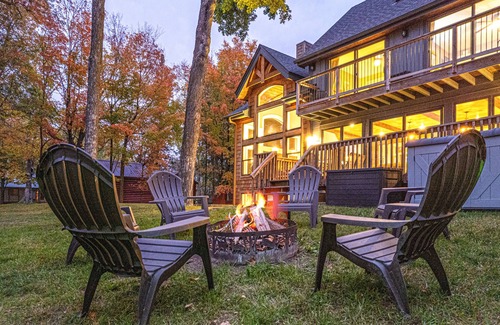 The property has a large, level yard and a huge, 1,000 SF dock with plenty of space for your boat to tie-off. Up to 2 boat lifts are also available for an additional fee. The end of the dock is a spacious, 16’x12’ sundeck and is also furnished with a 12’ bench that comfortably seats 8 adults – perfect for enjoying sunsets or the frequent, late-night fireworks from neighboring cabins around the lake. Your children will absolutely love the sandy shore/lake bottom and the 10’ waterslide! Plus, out 150 feet from shore, the water is just 3-4 feet deep – plenty of ‘safe’ water for your kids to play for hours! The fire pit will also satisfy the evening sweet-tooth for those who enjoy s’mores or other campfire meals and treats.
