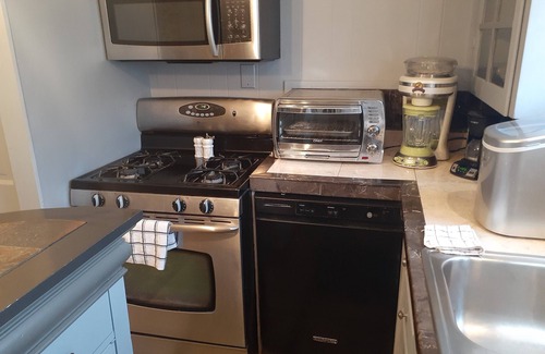 The fully stocked kitchen includes everything you need to cook a meal, while the large dining table seats four people. The front door has a coded lock, providing for the ease of keyless entry. Our Smart TV allows guests to login into their own Netflix or HULU, while our TV antenna provides basic channels that provides access to local news and major sports games. Help yourself to all our full size appliances, as well as provided coffee and tea! In the bathroom, soap, shampoo, and conditioner are provided for each guest.
