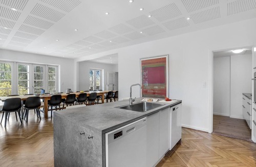 In the peaceful vacation area Marielyst welcomes you this wonderful house, which is suitable for larger groups or several families incl. pets because of its room layout. The house offers many, high quality and modern furnished rooms and makes all in all a very good impression. The lovely open kitchen with dining area and space for all guests appears stately and is furnished with fireplace for the cooler seasons.