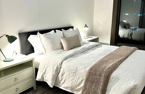 Peaceful Bedroom: Cozy queen bed, soft linens, and a serene backdrop of city lights.