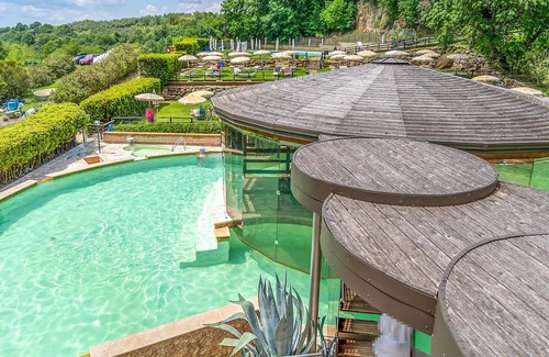 This beautiful spa complex in Sorano with independent cottages (10) and apartments (28) is built around an ancient parish church dating back to the year 1000 and is located in the green hills of southern Tuscany, in a region rich in thermal springs and Etruscan archaeological sites. The 7 ha property is located in an area with thermal springs, where the water flows in ancient pools and watercourses at 37°C. The peculiarity of these waters is the absence of sulfur and the richness in magnesium, zinc and calcium, essential elements for skin and body care. In fact, therapeutic treatments are allowed in the facility. In addition to two thermal pools (37 ° C) with waterfalls and natural whirlpools and a thermal pool for children, open all year round, the complex also includes an ancient thermal pool dating back to 1363 ( Bagni dei Frati) with two springs in the rocks in the woods (entrance fee), a wellness spa (bathing treatments, massages, mud therapy and other relaxing treatments), a sports swimming pool (18x11m), tennis court, a restaurant (table reservation on site) with organic menus with products from the surrounding areas. Terme di Sorano offers services that allow guests to alternate a relaxing vacation with hikes, mountain bike tours (rental on site), horseback riding (for a fee; riding stable on the adjacent estate) or day trips to Pitigliano and Sovana. The beautiful coasts of the Maremma are about 40 km away. On the adjacent estate, guests can visit an oil mill, participate in oil tastings and, in October / November, in the olive harvest. Novasol clients receive preferential rates for: Horseback riding excursions, dinner / lunch in the restaurant, purchase of farm products. Wi-Fi in common areas, baby crib and high chair for a fee. A tip: the waters of the Terme di Sorano are known for their healing effect on many skin diseases!