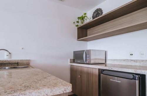 O apartamento dispõe de um quarto confortável com ar-condicionado, uma cozinha funcional equipada com frigobar e micro-ondas, e está localizado em um condomínio que é um verdadeiro resort urbano. Aproveite a piscina incrível, a academia moderna e uma estrutura completa que inclui lavanderia e mini mercado, tudo pensado para facilitar sua estadia.