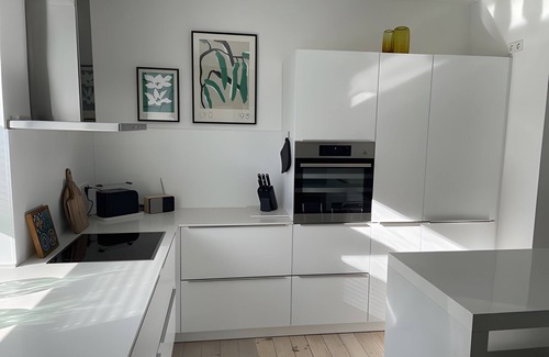 Kitchen with hob, oven, dishwasher, fridge, kettle, coffee machine, toaster, kitchen island as a bar table with high chairs, 2 TVs, Bluetooth radio, Wi-Fi and hairdryer.