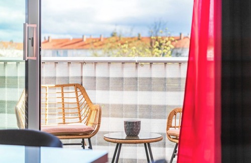 Relax on the balcony (enjoy the outdoor furniture!) of this apartment. As for the great indoors, you can come inside and enjoy the WiFi and TV.