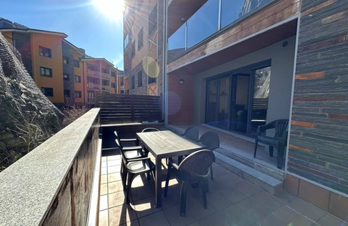 Apartments comple La Solana de El Tarter, at an altitude of 1700 m. 68 m2 apartment, in front of the Grandvalira ski slopes, 550 mts. from the El Tarter gondola. Cozy and spacious, with 2 double bedrooms (1 with two single beds and 1 with a double bed), a sofa bed in the living room and 2 bathrooms (1 with a bathtub and the other with a shower). It is equipped with a kitchenette, ceramic hob, fridge, oven, microwave, dishes, cutlery, kitchen utensils, coffee maker, toaster, dishwasher, washing machine and dryer machine. Television, wifi and fireplace. It has a large terrace with table and chairs. 2 car garage in the same building. (Difficult access for large cars).Located in El Tarter: