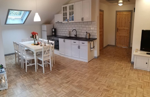 This apartment features a living room with a TV and a kitchenette with a dishwasher and a refrigerator, as well as a fully equipped kitchen. On request we provide a travel cot and a high chair for children.