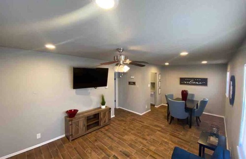 This is an entire apartment in a small apartment complex of 5 units. The entire apartment has been fully remodeled it has been upgraded with refrigerated air, and fixtures throughout the space. It has a full bedroom, bath and living room with a smart TV for your enjoyment. It has a full kitchen with all of the basic utensils needed.ck back and relax in this calm, stylish space.