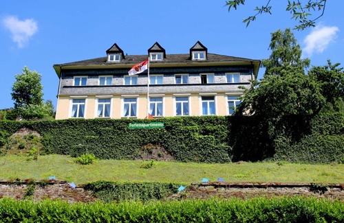 Former wine-growing school, located directly on the river, quiet, a few minutes' walk to the historic city center. View of the Moselle, landing stage for the hotel ships, vineyards and the Pinnerberg vantage point, with the cross illuminated at night.