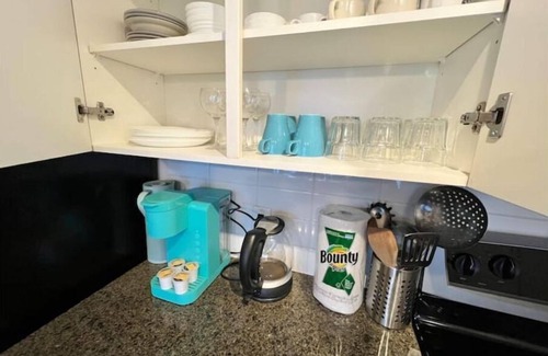 The suite is modern and well-appointed, with a cozy living area, a bedroom has a comfortable queen bed, and a single bed in the living area. A fully equipped kitchen where guests can prepare their meals. It may also a balcony or large windows with views of the cityscape and partial ocean view.