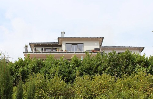 Welcome to our apartment "Zum Glücksberg"! On the sunny side high above Saarburg enjoy pure holiday with a breathtaking, beautiful view over the city of Saarburg and the endless valleys towards France. The modern and exclusively equipped apartment with sun terrace invites you to unwind and live in the day. You can park your car in our carport. We want you to feel at home right from the start. It is therefore important to us to offer you a spacious living atmosphere. In the 64 sqm apartment, consisting of living room, integrated spacious kitchen, dining table, separate bedroom, modern bathroom with rain shower, you should not miss anything. The apartment has underfloor heating.