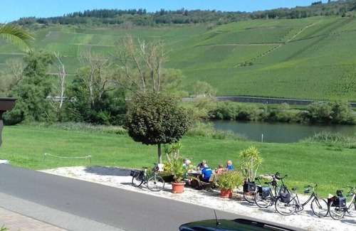 The cozy apartment (approx. 50sqm) offers enough space for 2 possibly 3 people with a large balcony (approx. 12qm) with a seating group. From here you have a view of the Moselle and the opposite vineyards. The apartment is located directly on the Moselle Cycle Path. With us you will find relaxation in a prime location. Apartment with a spacious parking lot and a closed bike/motorcycle garage. Internet connection. Bread service.