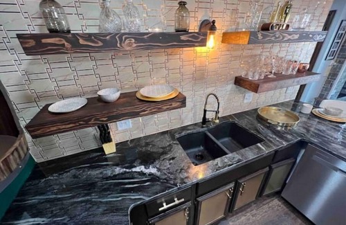 Burlesque king bedroom, mafia queen bdrm. New in unit laundry (one machine wash and dry), gold inlay retro tile and stonework, waterfall granite countertops, custom design elements and cabinets, and selectively procured period accents to delight our guests. Heavy gold block style hardware and bathroom accessories.