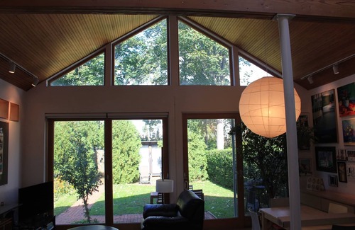 Designed and built in 2003, this cozy house has water views of Peconic Bay, enormous glass skylights, fully equipped kitchen, two bedroom, two bath, washer, dryer, Wifi, flat screen tv, private rose garden, outdoor studio/bedroom, private parking, a kayak, bicycles, public swimming dock at end of block, and is one block from the charming seaside village of Greenport, NY. We are located 95 miles east of New York City on Long Island's North Fork with 5 minute walking access to NY city bus and train. Great small restaurants & a terrific micro brewery are 1/2 block away.