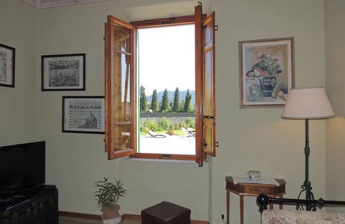 CIN: IT046005C2IBZ5JIG3. Villa Maria Giulia, beautifully restored, is a luxury, charming Tuscan gem of the 19th century, comely decorated with antiques and frescos and elegantly furnished with all modern comforts. The ancient boundary wall and the electric gate grant quietness and seclusion even if you are just few steps far away from the town centre. The house accommodates 11 persons self catering with its 5 double and 1 single bedrooms – 5 on the 1st and 1 on the ground floor. The 4 double bedrooms on the 1st floor have air conditioning as the other two have fans. It has a traditional living-kitchen with access to a terrace with BBQ and a communicating dining room. A large additional living/dining room with terrace grants relaxing moments as well as the large garden surrounding the whole house with scented shrubs, roses, century-old palm trees and the swimming pool (8m. x 4m. depth 1.20 - 1.50m). In the pool area a relaxing room with sofas and tea maker and the nearby terrace in shadow grants a great time.