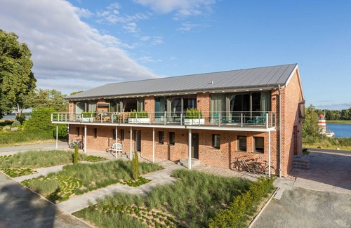 The Alte Scheune am Focker Strom attracts the guests from the very first moment on Ummanz. This is ensured by the unique view of the water, which is close enough to touch and gives holidaymakers an unprecedented holiday experience. But it also depends on the "inner values" and these four cottages with 110 to 130 square meters have on two floors a lot to offer: Starting with the two bedrooms and two bathrooms with floor-deep showers to a sauna and a fireplace, which makes the stay on Ummanz in every season its charm. In the summer you can enjoy the gentle breeze, in the winter you make it in the evening cuddly and cozy. While the spacious sleeping area is located on the ground floor, the upstairs living area impresses with ceilings that are up to four meters high. The luxurious interior is complemented by the fully equipped kitchen, three HDTVs, a hi-fi system, designer furniture and of course wireless internet access. Above all, the view from the living room has its charm, because there you can let your eyes wander over the foothills of the Baltic Sea. The balcony on the west side also invites you to enjoy the sunshine quite relaxed. Excellent location The location "Am Focker Strom", just after the bridge that leads from Rügen to Ummanz, is not only a very personal viewpoint for all guests, but also an excellent starting point to discover the island in all its facets. This includes a walk already the neighboring church, which ensures twice a day with its church bells for an authentic island feeling. These four holiday cottages on Ummanz, which offer ample space for up to four people, are just as brilliant a choice for a family with children as they are for a family with a dog or a solo traveler looking for a relaxing break. A car parking space and covered bicycle storage are part of these holiday homes.