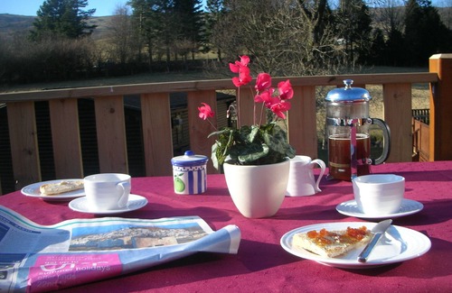 Accommodation - the lodge is fully double glazed and centrally heated throughout, making it a cosy retreat at all times of the year. There is a a large, wall mounted TV, plus DVD and CD players and the three seater, leather sofa and large arm chairs are extremely comfortable! The modern fireplace and attractive,... contemporary dining furniture are complemented by matching side tables, large coffee table and a well stocked bookcase. We also have a range of walking guides, maps, DVDs, CDs and games, for both children and adults.