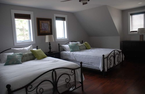 Inside, the cottage offers approximately 4600 square feet of living space with two full bathrooms (note one is an en-suite) and two half baths. There are 6 spacious bedrooms in total, two on each floor. The two bedrooms on the second floor each offer enough space for a family of four to stay together. The Great Room has a spectacular view and offers a variety of seating options. There is also a seating area located in the loft where guests can relax and take in the view of the Madawaska river. The kitchen is fully stocked and includes an island for eating. There is also a large dining area with an extended table suitable for larger groups. There are two full size fridges with freezers and one bar fridge to hold food and drinks for your stay. The large sunroom provides space to relax and enjoy the fireplace in the winter or just hang out in the summer with a view of the water. A covered deck area provides shade for hot summer days.