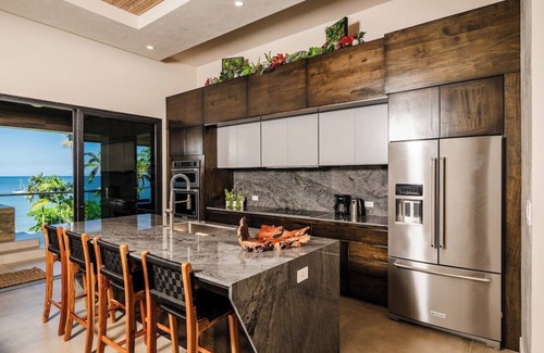 Villa Verde’s modern, breezy concept takes its cues from the nearby Playa Potrero. Surrounded by diverse wildlife and serene waters, you’ll take in the best of Costa Rica from its three-story, open façade. On the main floor, enjoy a large lounge area with a flat-screen TV and sectional seating facing the ocean. The open downstairs space also houses a full chef’s kitchen to keep meal prep easy. Take in dinner under the stars, or eat indoors, with flexible dining areas for up to 20 people.