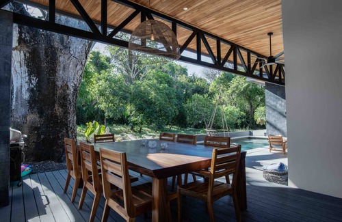 Large indoor/outdoor living space with gourmet kitchen, 80" TV, balinese natural stone pool, custom wood dining table all overlooking the beautiful natural protected jungle .
